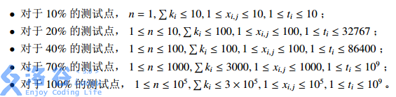小 K 对这些到达海港的船只非常感兴趣,他按照时间记录下了到达海港的每一艘船只情况;对于第 i 艘到达的船,他记录了这艘船到达的时间 ti (单位:秒),船上的乘 客数$k_i$,以及每名乘客的国籍 $x_{i,1}, x_{i,2},…,x_{i,k}$。